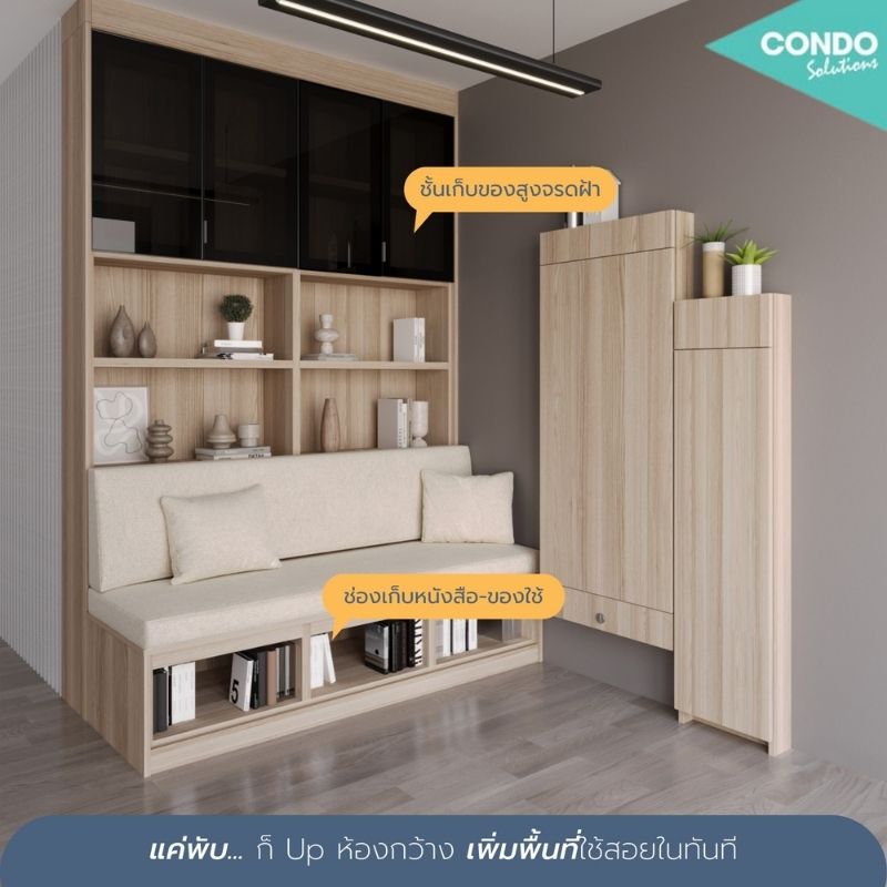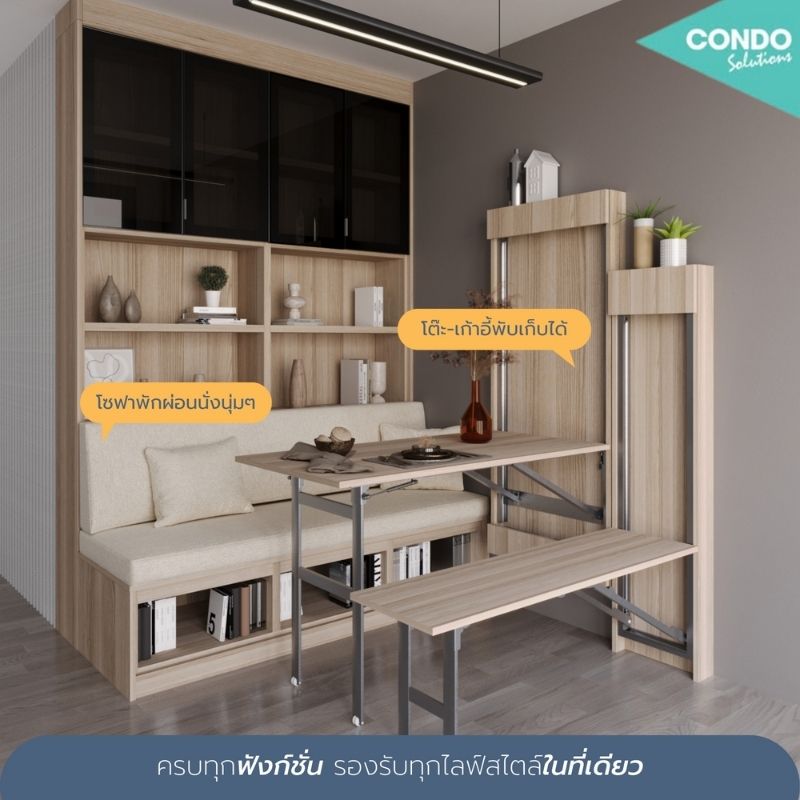 ทั้งโต๊ะ-เก้าอี้แบบพับเก็บได้ โซฟานุ่ม ๆ มีช่องไว้เก็บหนังสือ กำแพงก็ไม่ปล่อยให้เสียเปล่าบิลท์ฯ ชั้นวางและตู้เก็บของจุใจ จะกินข้าว ทำงาน อ่านหนังสือ หรือพักผ่อนหลังเลิกงาน ก็สลับโหมดได้ทันที แค่พับ…ห้องก็ดูกว้างขึ้น
