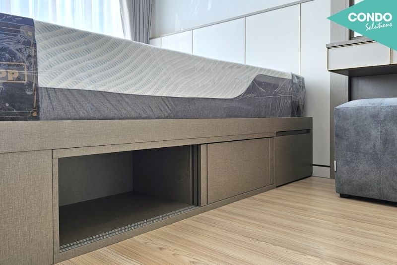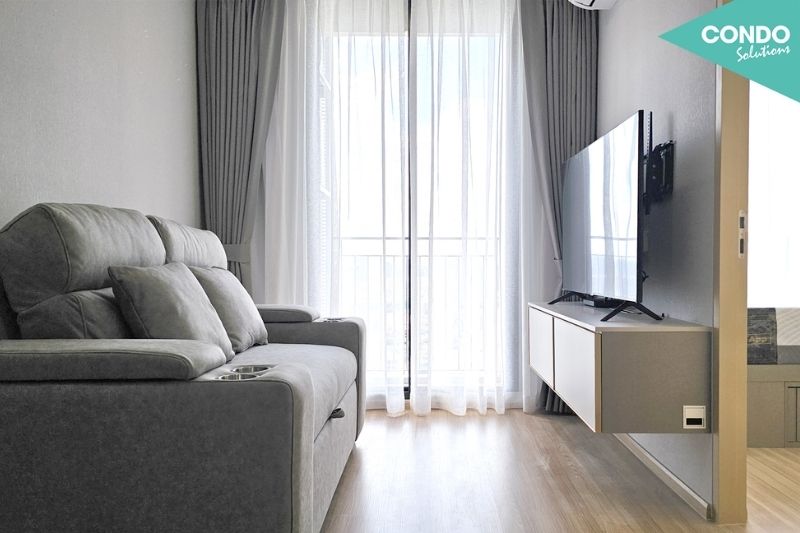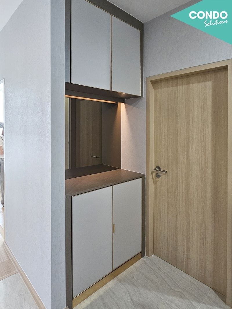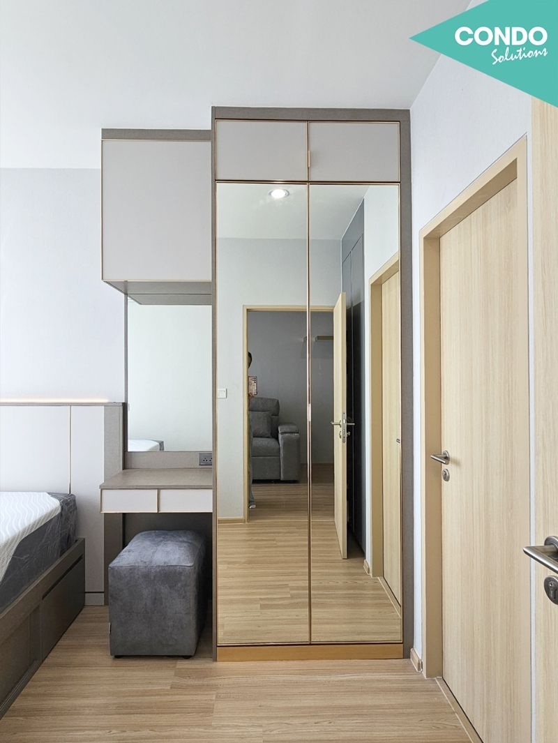 ห้องนี้ตกเเต่งสไตล์โมิเดิร์น เลือกใช้วัสดุโทนสีเทาอ่อน ช่วยให้ห้องดูสว่าง ผ่อนคลายเหมาะกับเป็นมุมพักผ่อน มาพร้อมดีไซน์ที่ฟังก์ชันครบ ใช้งานได้จริงทุกมุม